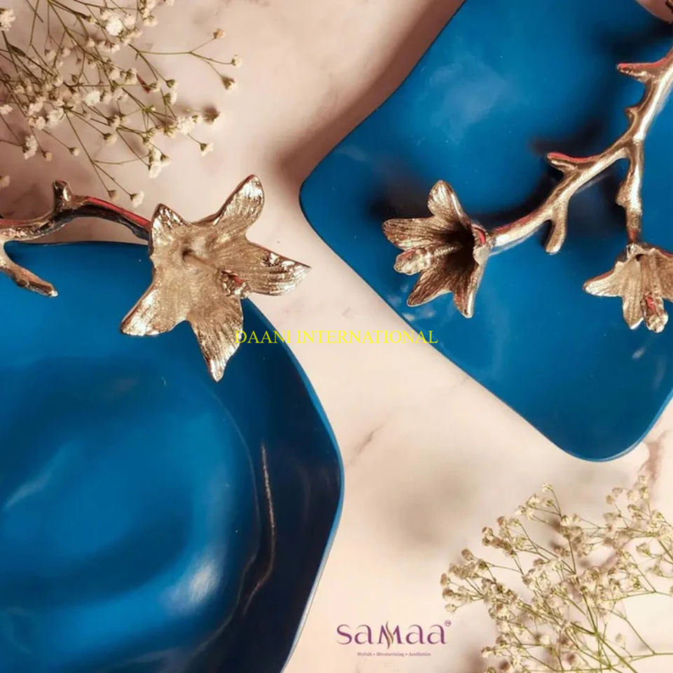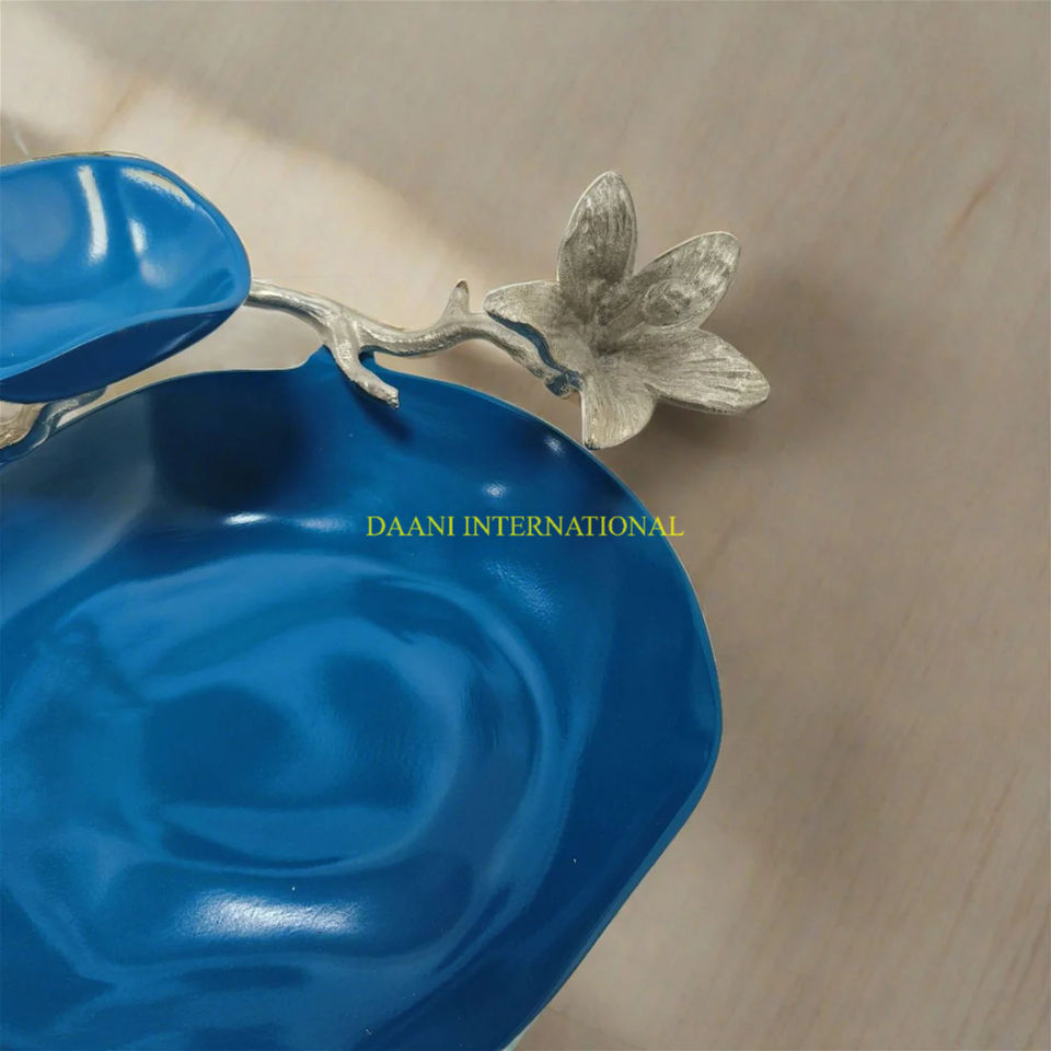 Elegant Blue Enamel Dual Serving Bowl with Silver Floral Branch Design for Snacks and Dry Fruits Aluminum Chip And Dip Bowl