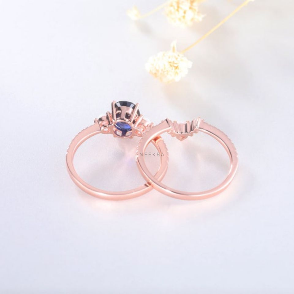 Elegant Blue Gemstone Wedding Jewelry, 10K Solid Rose Gold Oval Cut Lab-Sapphire Engagement Ring Paired with Opal Stacking Band