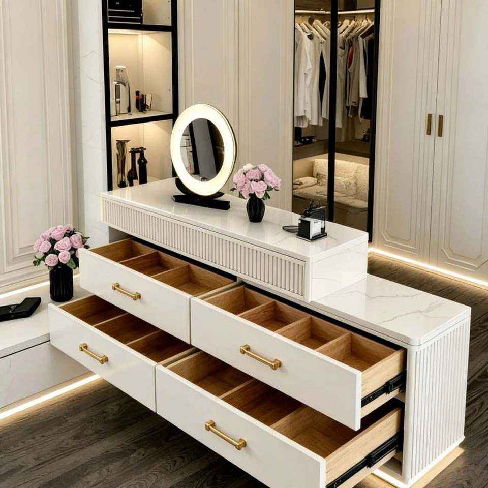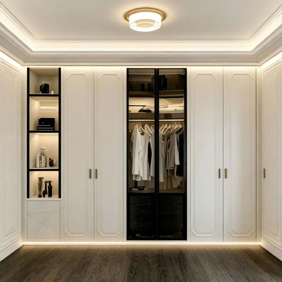 Elegant Built-In Walk-In Closet With Vanity Integrated Lighting White & Black Wardrobe Storage Furniture