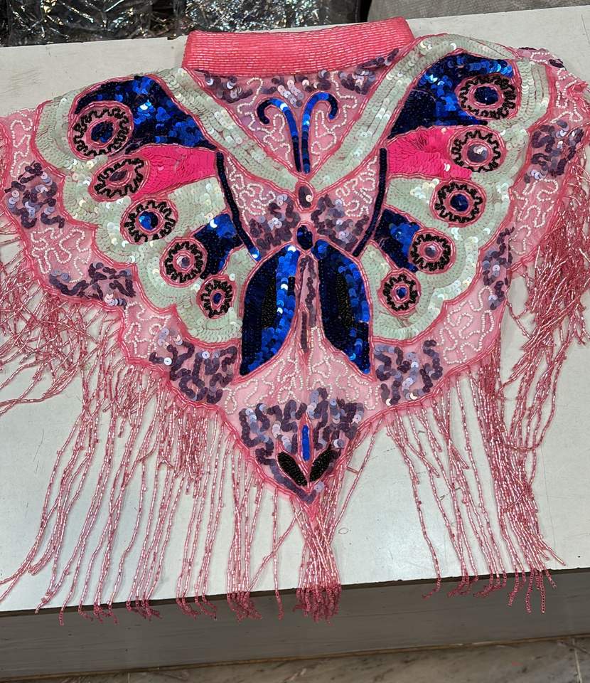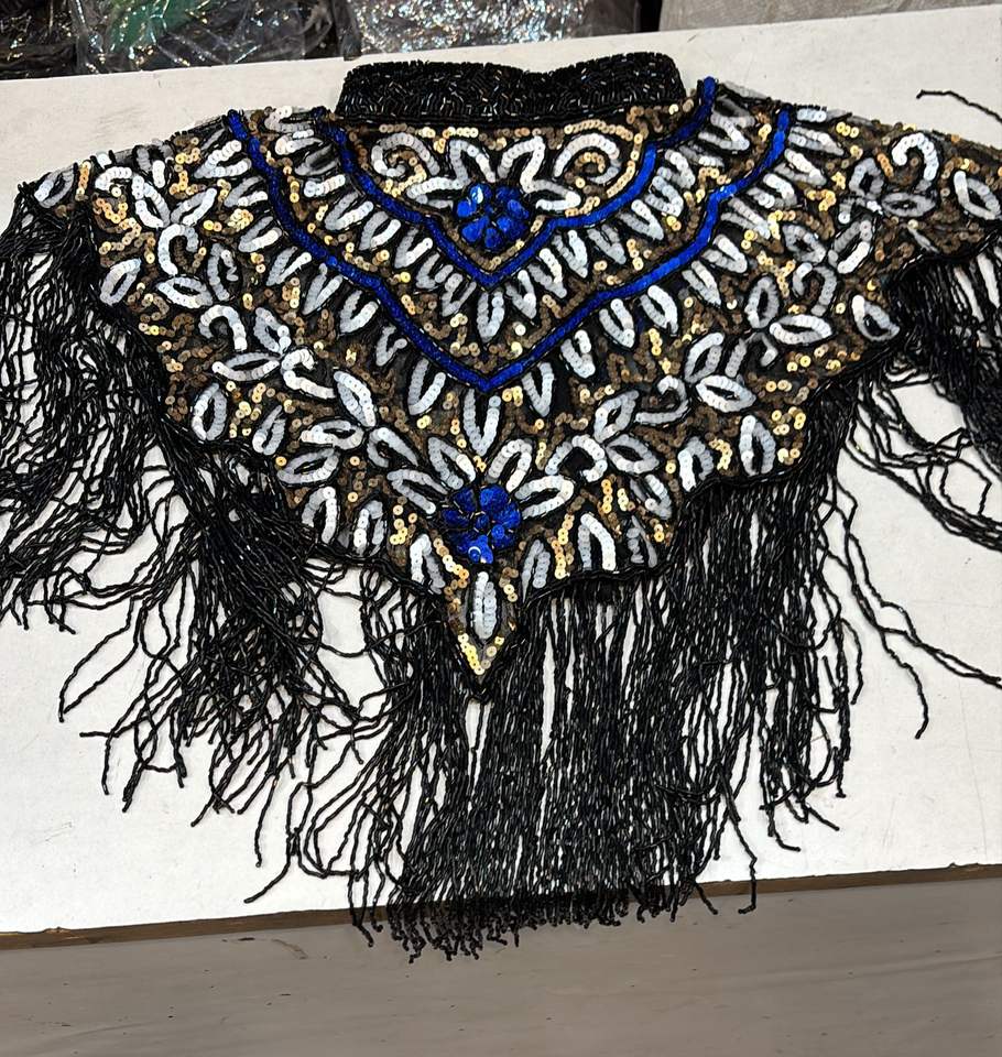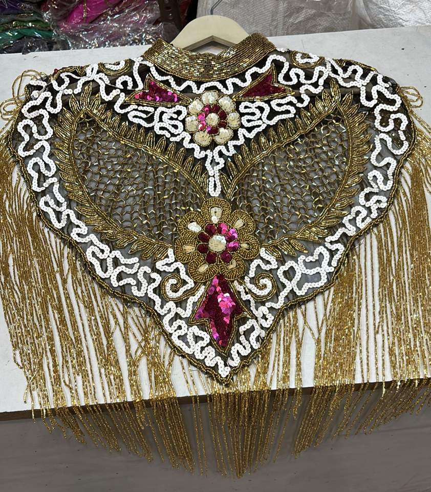 Elegant Burlesque Festival Dress Beaded Strands Sequins Pearls Embroidery Straight Silhouette Fastens Neck Festive Cape Natural