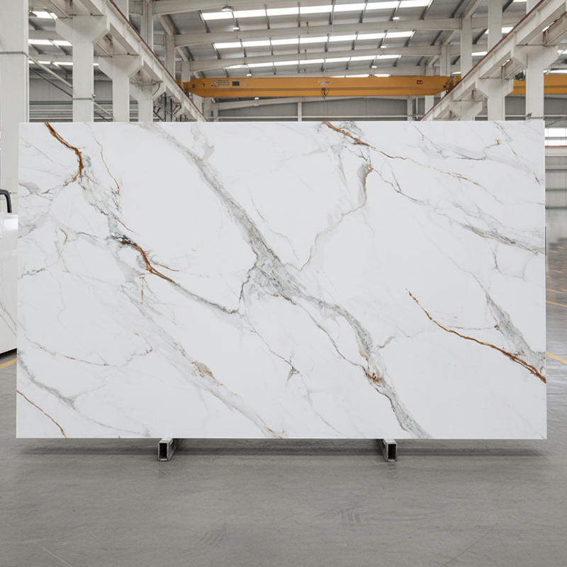 Elegant Calacatta White with Natural Grey & Gold Vein Polished Slab Quartz Countertop for Luxury Kitchen Projects