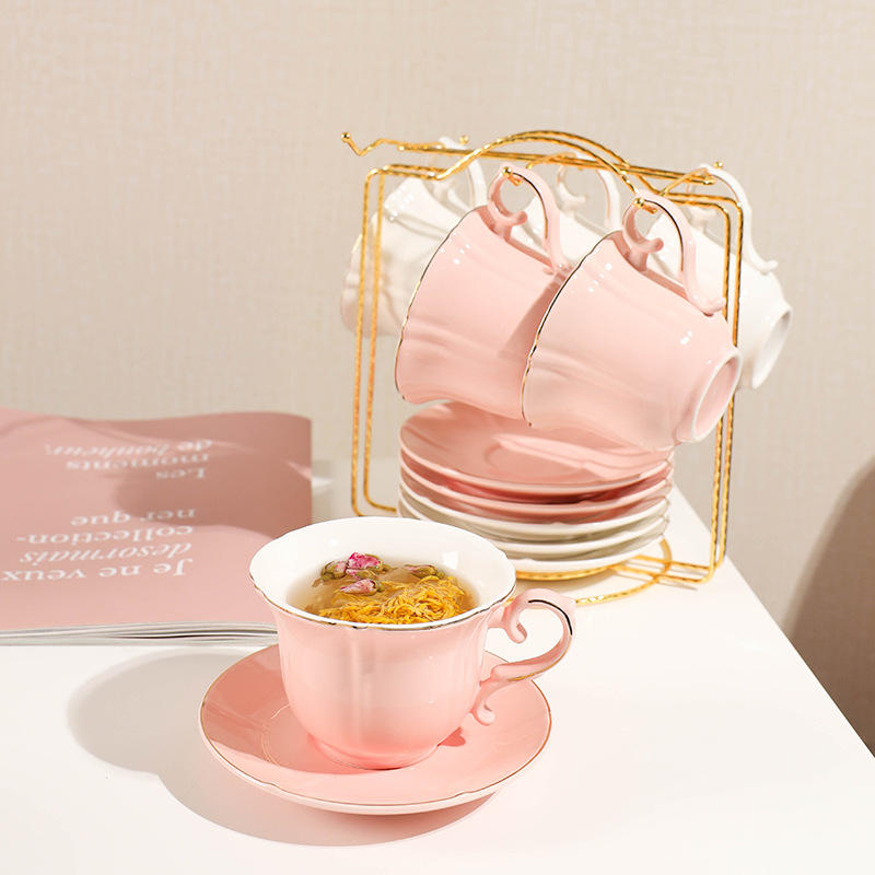 Elegant Ceramic Coffee Cup And Saucer Set With Stand For Afternoon Tea European Style Solid Color Round Handle Design