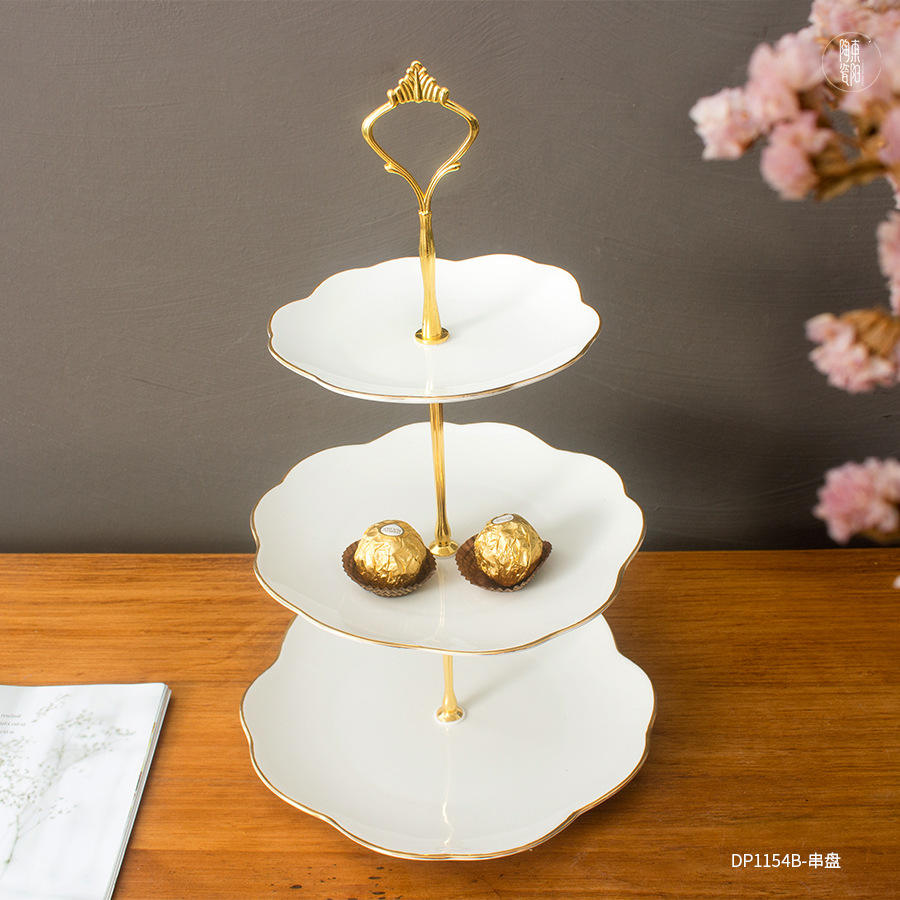 Elegant Ceramic Multi Tier Cake Stand White Gold Trim Irregular Shape For Party Hotel Dessert Serving DP1154B