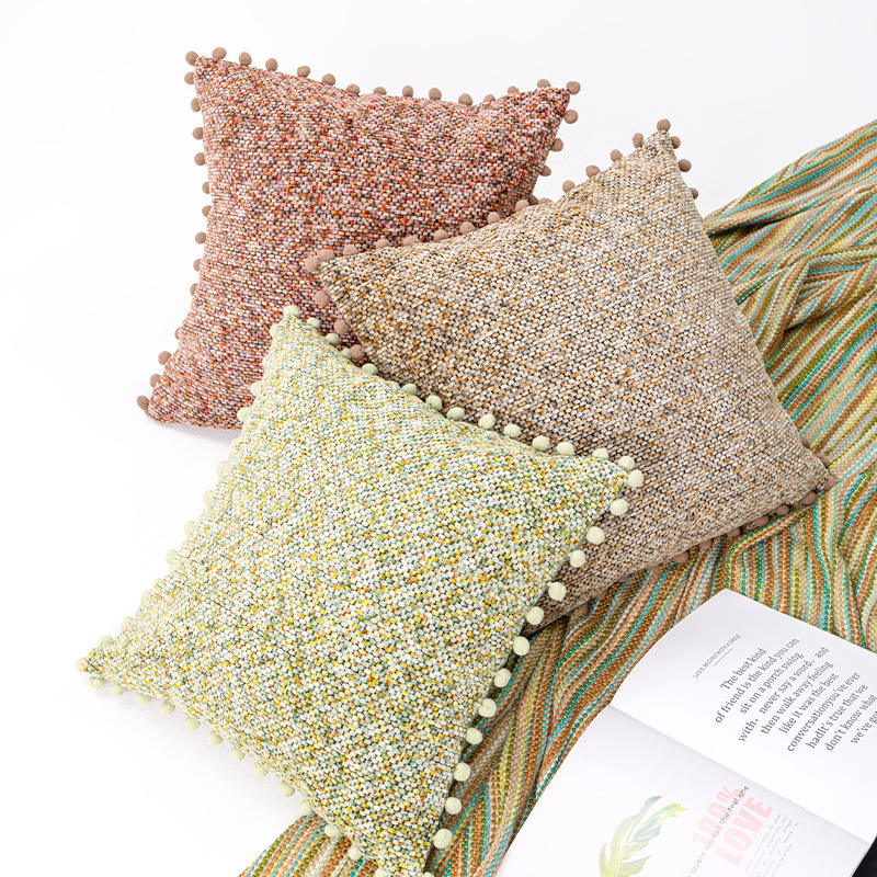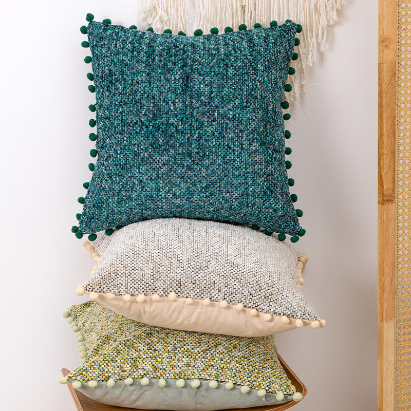 Elegant Chenille Throw Pillows Square Solid Color With Pom Poms Removable Cover For Living Room Sofa Bed Decor