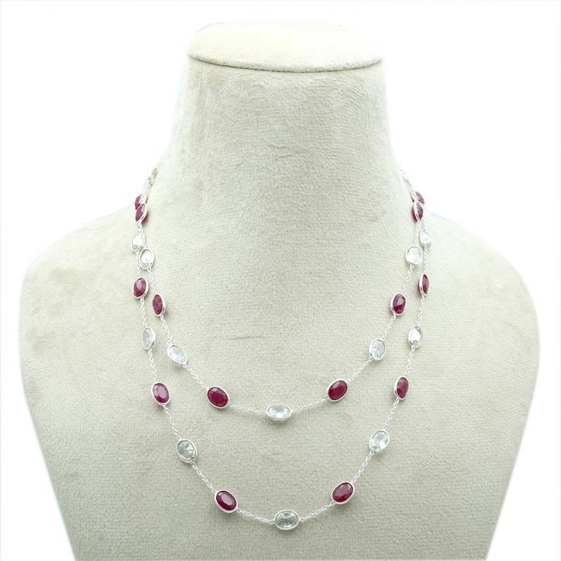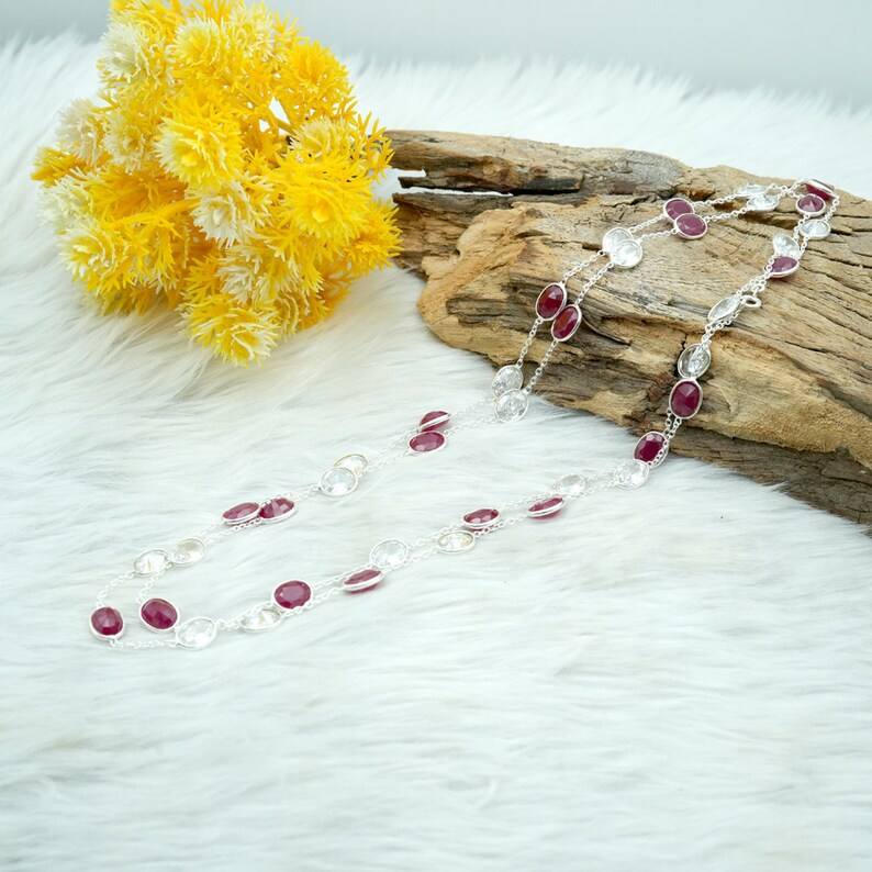 Elegant Christian Red White Garnet Necklace Handmade Rose Gold Plated 925 Sterling Silver Longer Oval Bezel Chain Engagement