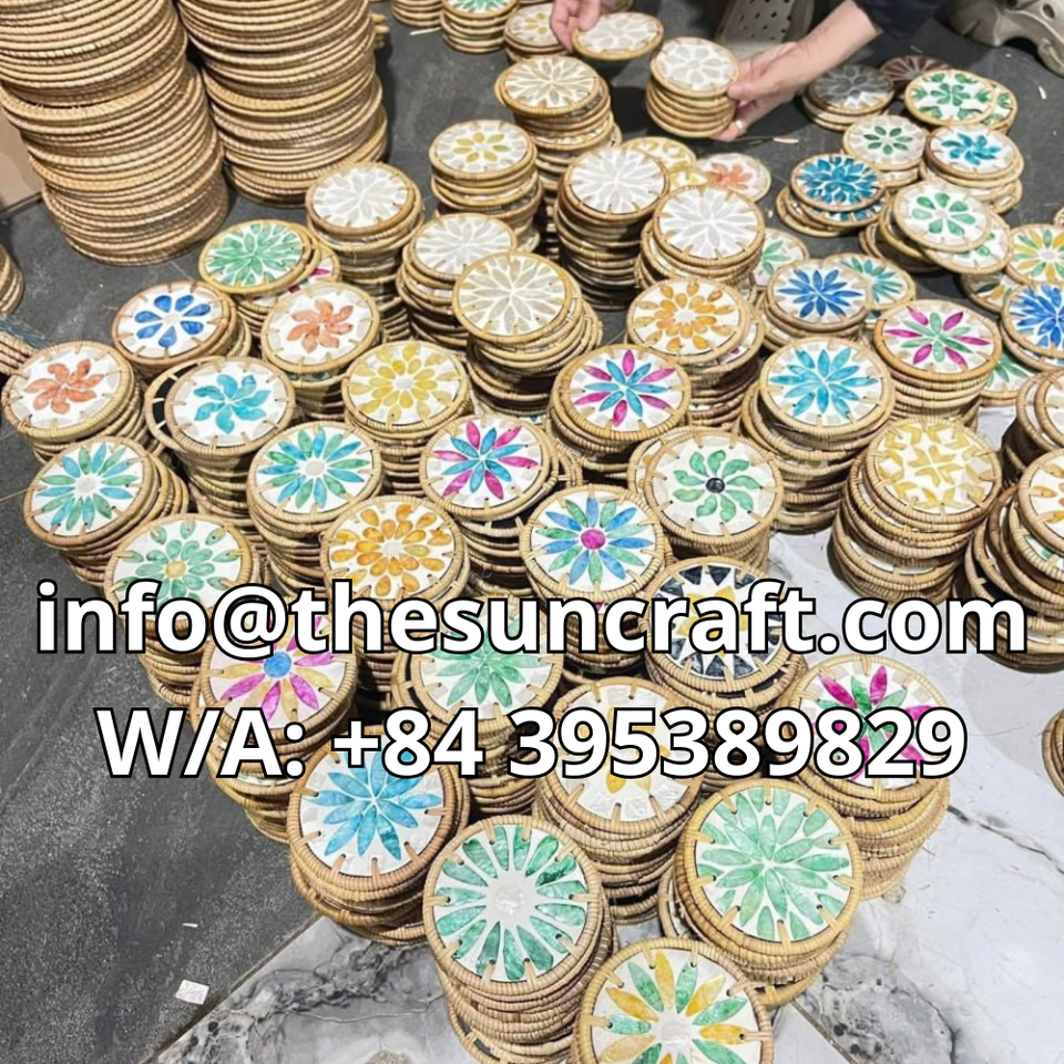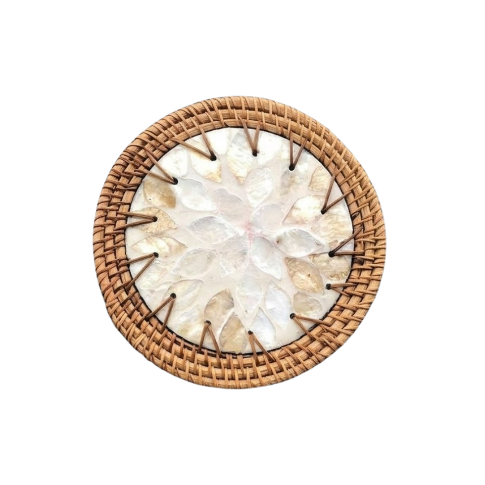 Elegant Circular Rattan-Edged Shell Coaster - Heat-Insulating Mother-of-Pearl Inlay - Modern Craft Tableware