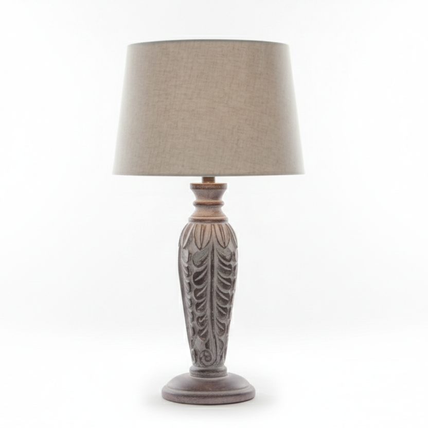 Elegant Classic Table Lamp Featuring Intricate Carving Pattern Base With Soft Neutral Fabric Shade Suitable For Home Hotel Room