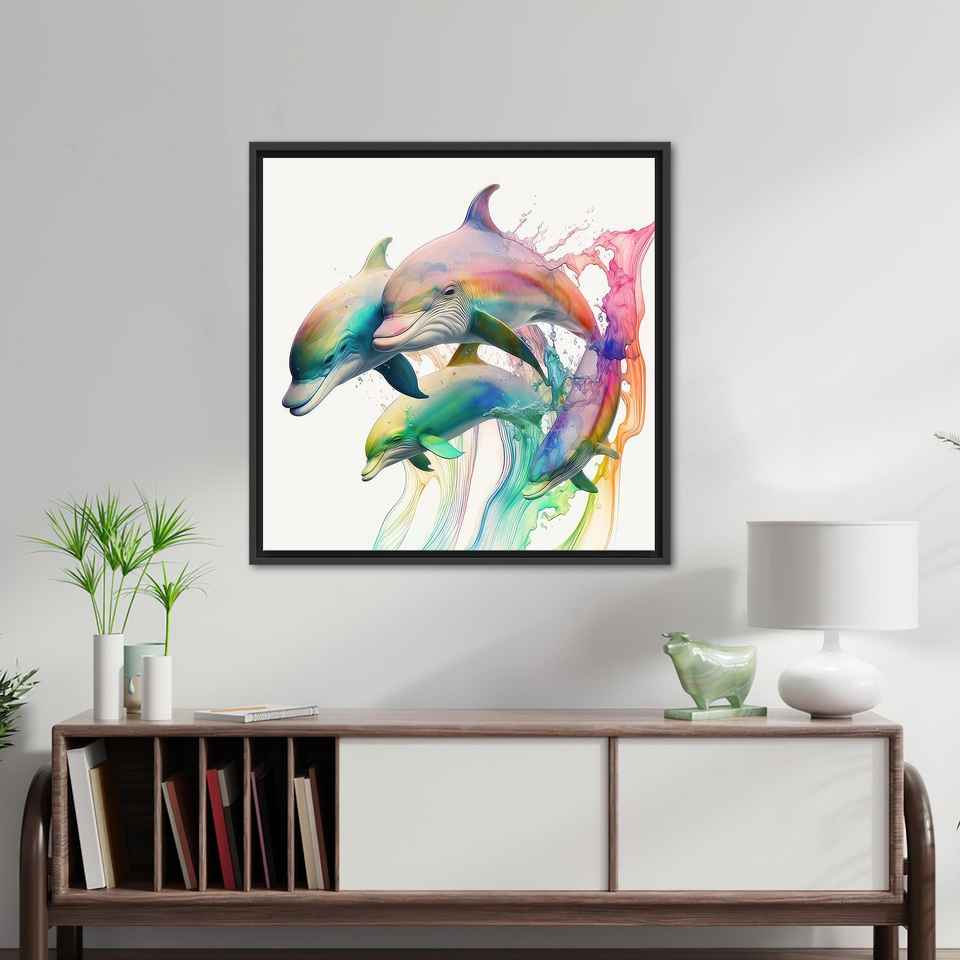 Elegant Colorful Dolphin Canvas Art: Premium Printed Wall Decor,BLACK FRAMED CANVAS