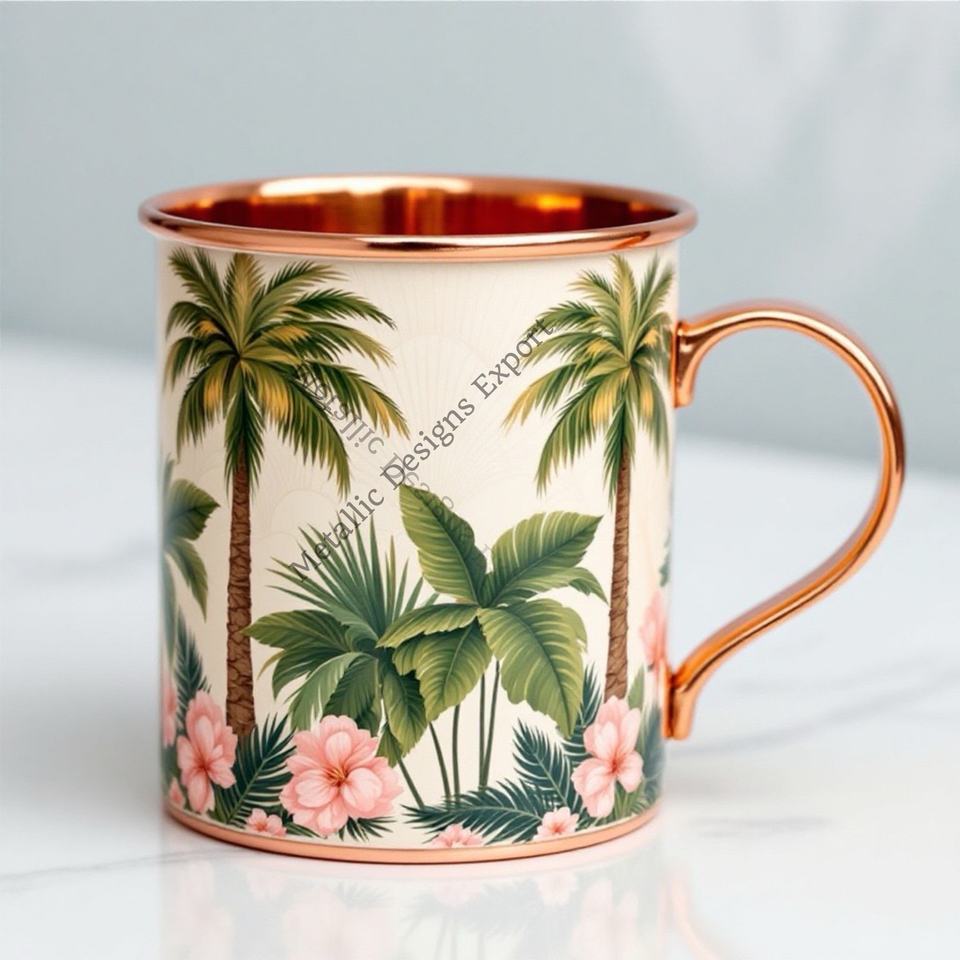 Elegant Copper Straight Mug with Tropical Floral Sticker Metal Perfect Gift, High-Quality Coffee Tea Cup Beautiful Decor Accents