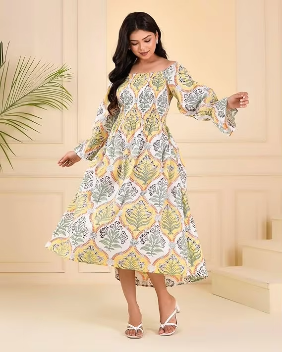 Elegant Crepe Silk Summer Dress With Yellow And Green Leaf Print Featuring Bell Sleeves And Natural Waistline