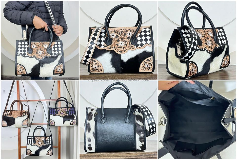 Product Name:Hand Tooled Checkered Leather Crossbody Tote Bag