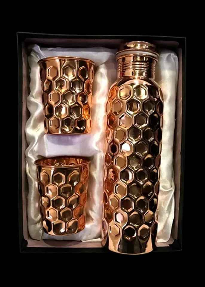 Elegant Diamond-Shaped Copper Water Bottle Set with Two Glasses Dishwasher Safe Eco-Friendly Unbreakable & Compact Design