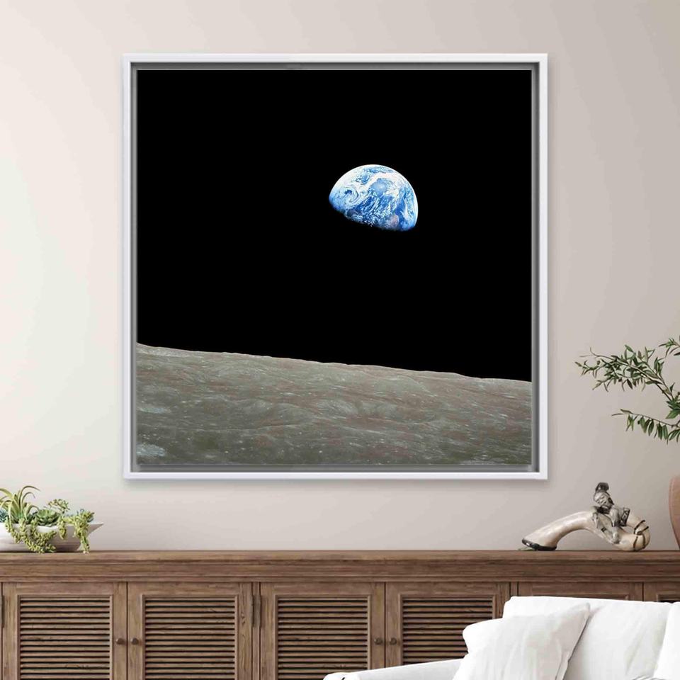 Elegant Earthrise Printed Canvas: NASA Wall Art, Office Decor, Wedding Gift,White Framed
