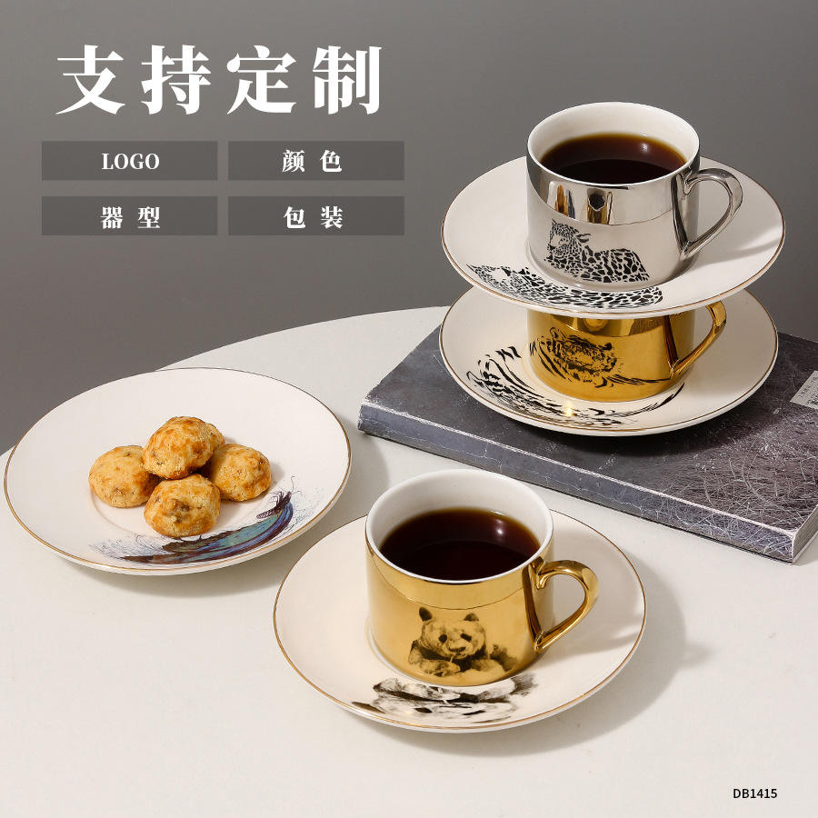 Elegant Electroplated Ceramic Coffee Cup And Saucer Set With Mirror Finish Panda Leopard Design For Afternoon Tea