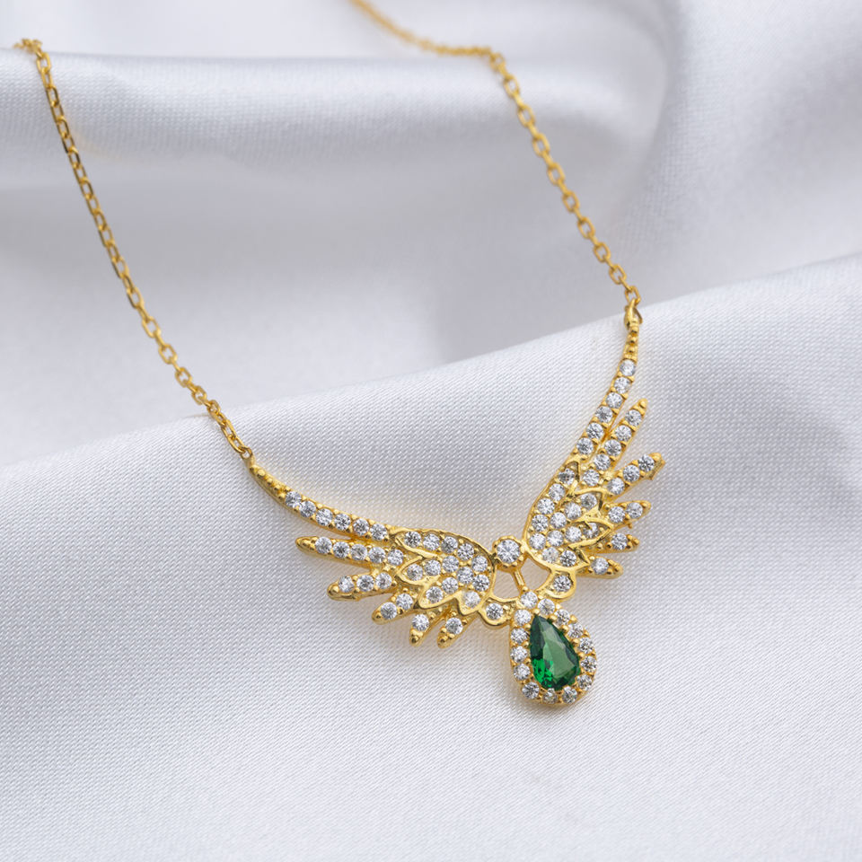Elegant Emerald Drop Design CZ Stone Angel Wing Charm Necklace Wholesale Jewelry 925 Silver