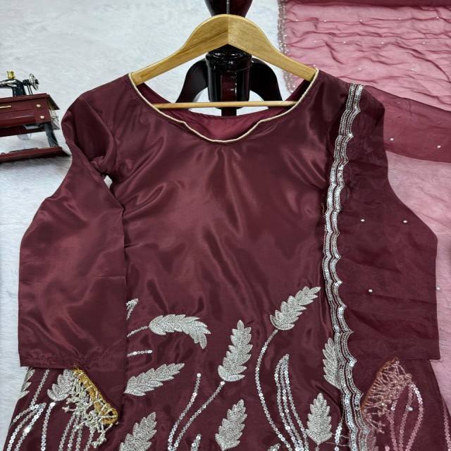 Elegant Faux Georgette Farshi Suit Set with Thread and Sequin Work Includes Organza Silk Dupatta with Rivet Moti and Lace Border