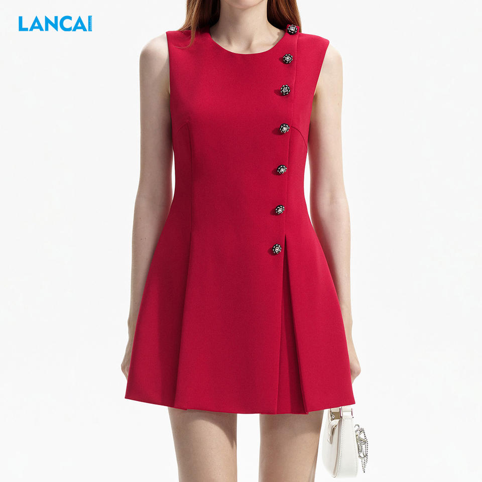 Elegant Festive-Friendly Women Mini Dress O-neck Sleeveless Diamante Buttons Zip at Back Split at Hem Pleated Skirt Lined Dress