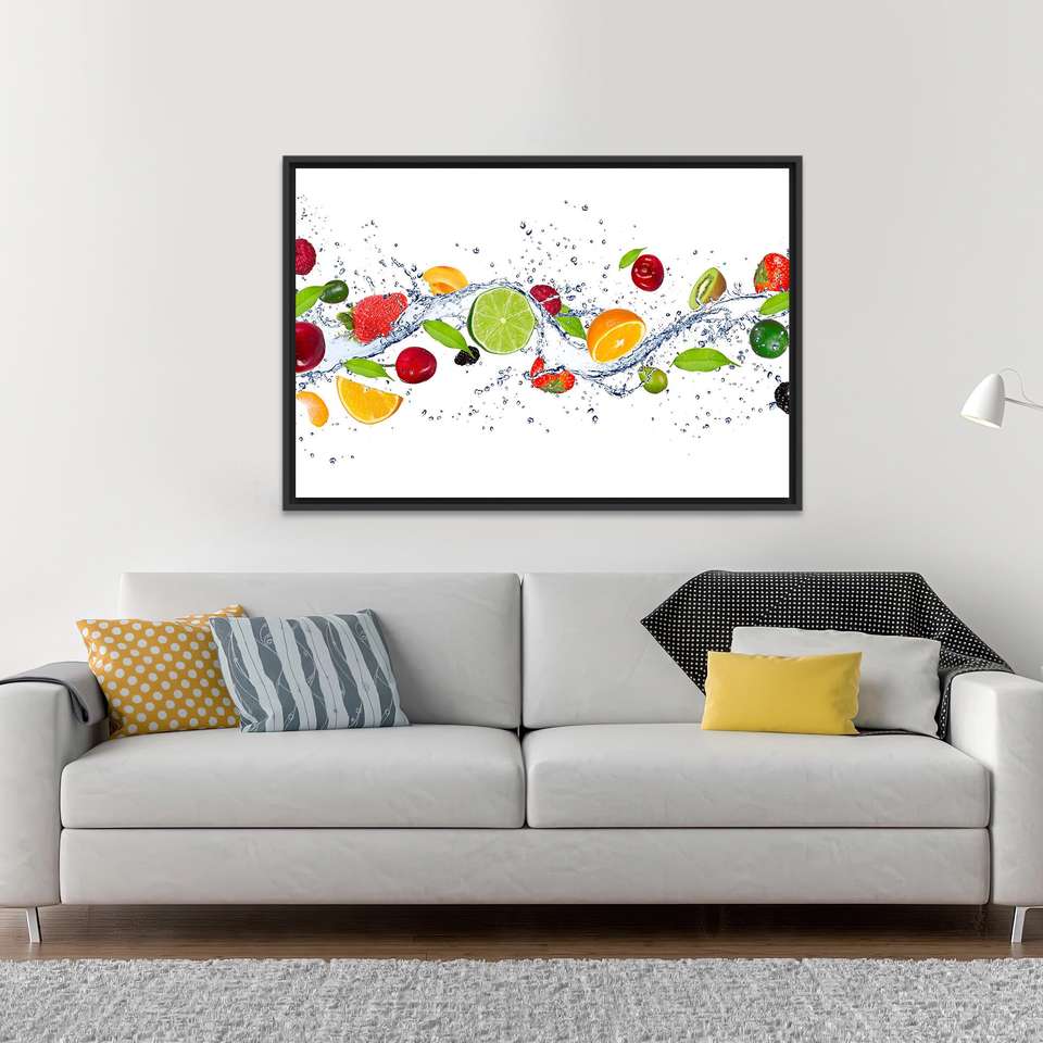 Elegant Fruits Splash Canvas Print: Modern Kitchen Wall Art,BLACK FRAMED CANVAS