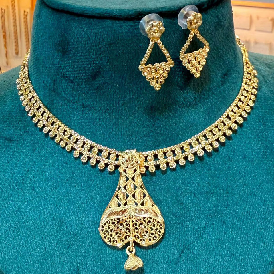 Elegant Gold-Plated Floral Pendant Choker Necklace Set with Matching Earrings for Bridal & Festive Occasions-Model 23143