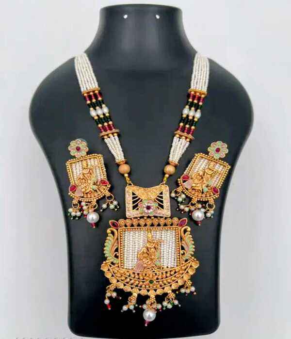 Elegant Gold Plated Pota Stone and Pearl Long Necklace Set Perfect for Indian Weddings Cultural Events and Evening Celebrations