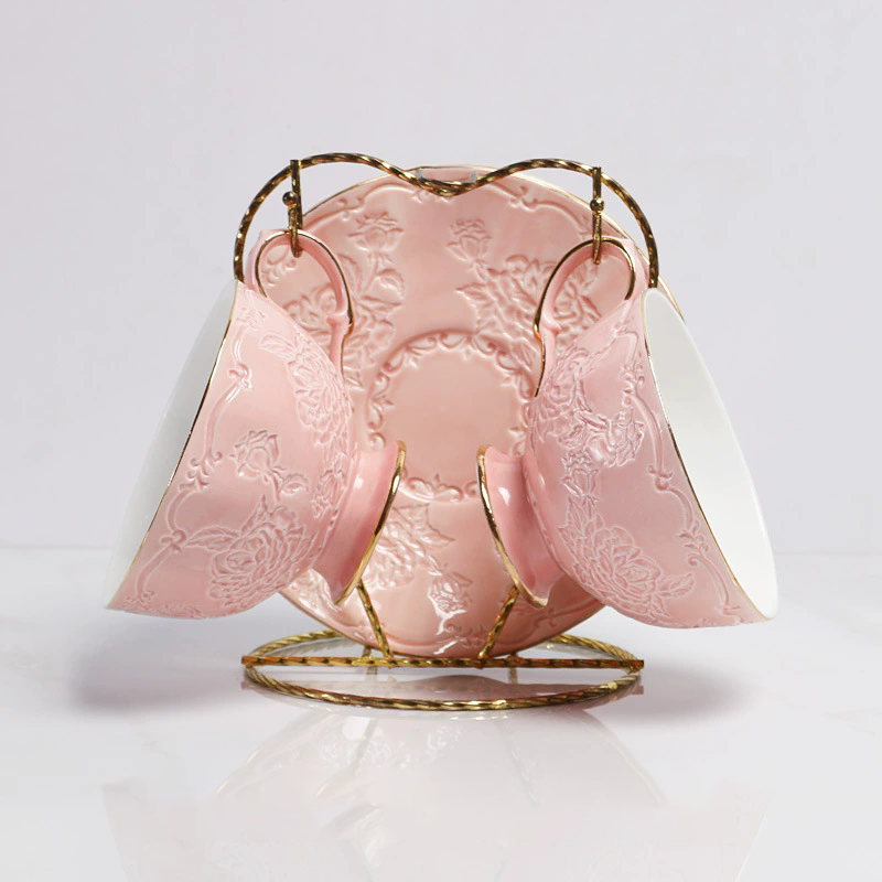 Elegant Gold Rim Coffee and Tea Cup Saucer Set Fine Bone China Ceramic Factory Embossed Luxurious Porcelain Design