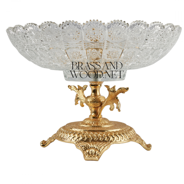 Elegant Golden Brass and Crystal Dessert Bowl with Intricate Detailing and Ornate Classic Decorative Base