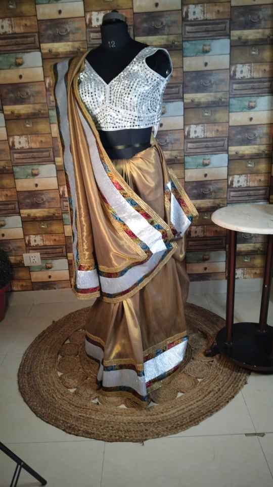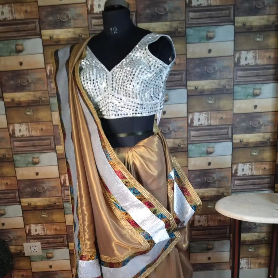 Elegant Golden Saree With Silver Sequin Blouse and Multicolored Border