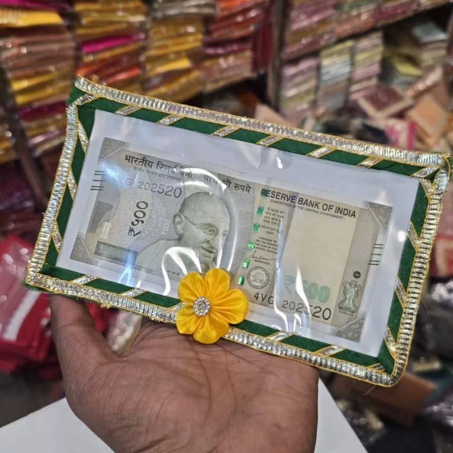 Elegant Green Gold Border Shagun Money Holder Handcrafted Zipper Closure Currency Note Presenter for Weddings
