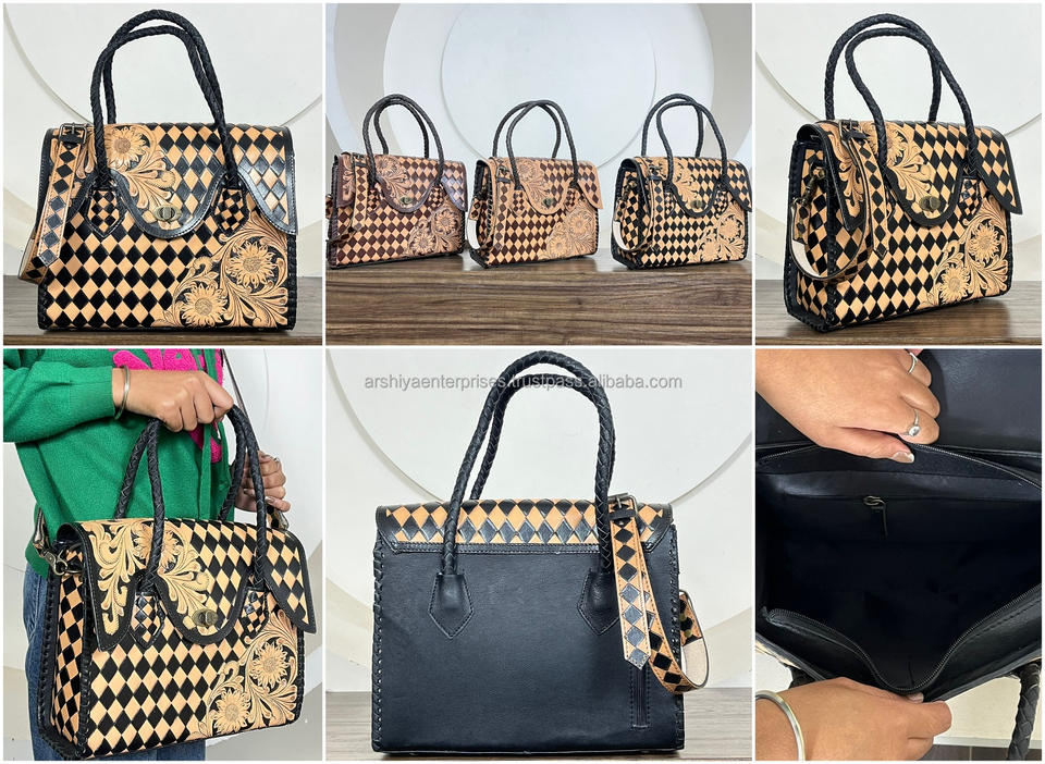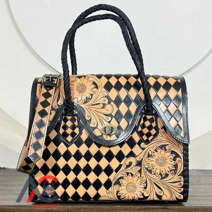 Elegant Hand Tooled Cowhide Leather Tote Bag With Crossbody Strap Designer Checkered Pattern Western Style Handbag for Women's