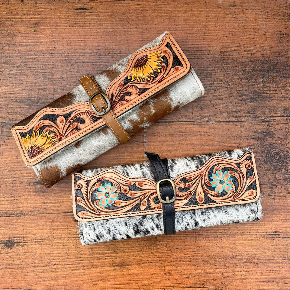 Elegant Hand Tooled Foldable Jewelry Organizer Western Cowhide Floral Portable Jewelry Roll Genuine Leather Travel Jewelry Case