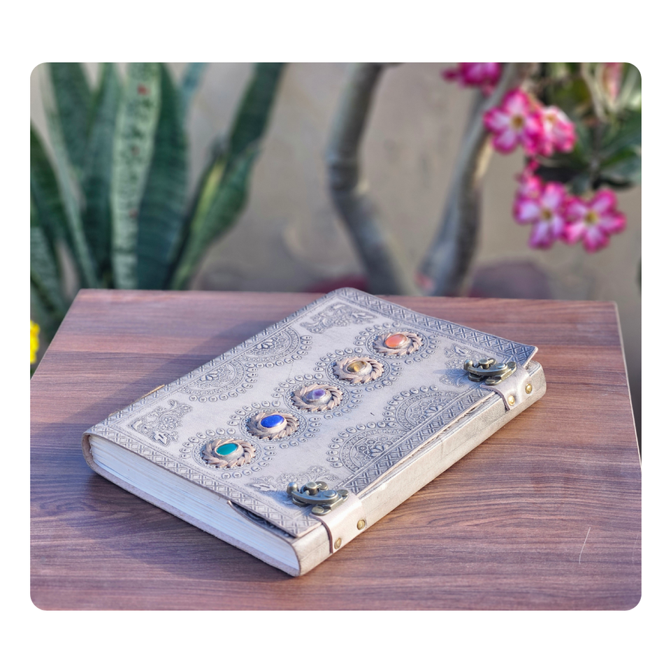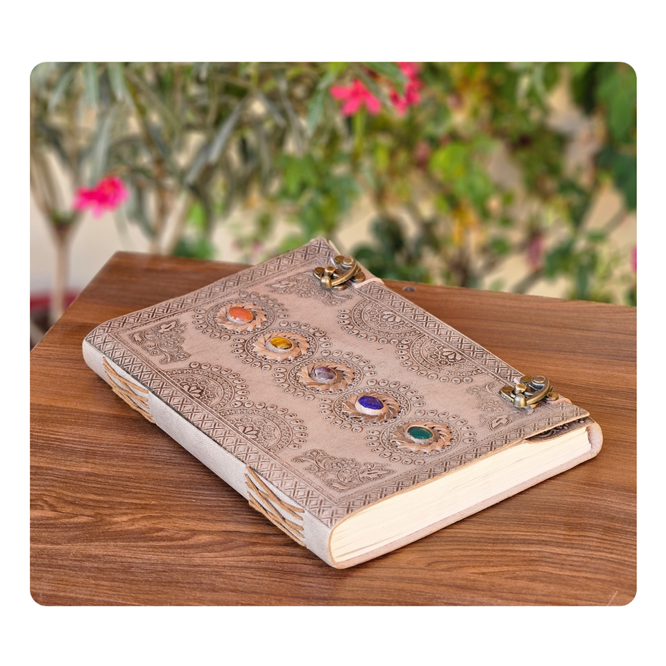 Elegant Handcrafted 5 Stone Embossed Leather Journal Vintage Diary with Gemstones and Dual Brass Latches for Business Office Use
