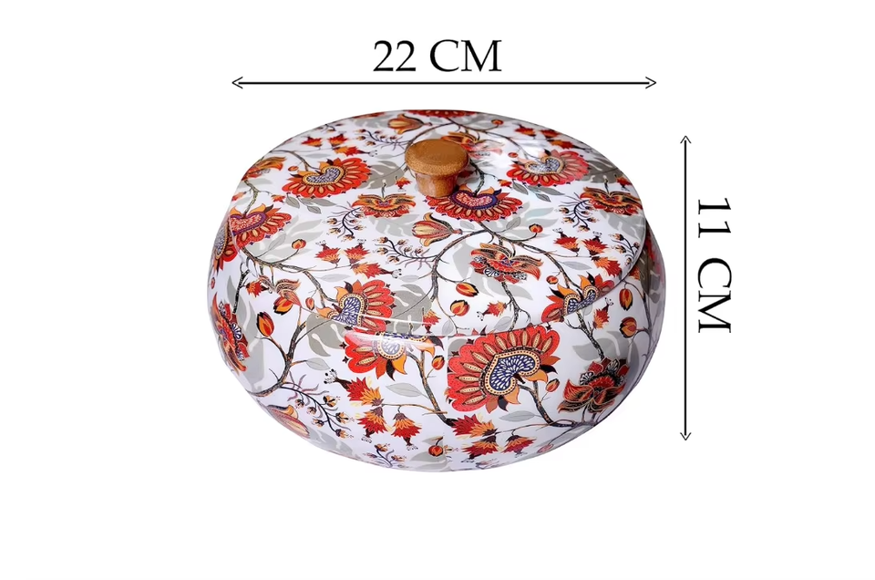 Elegant Handcrafted Designer Wood Casserole with Luxury Style Elegant Round Glass Serving Tray Enamel Printed Lid for TradeByD