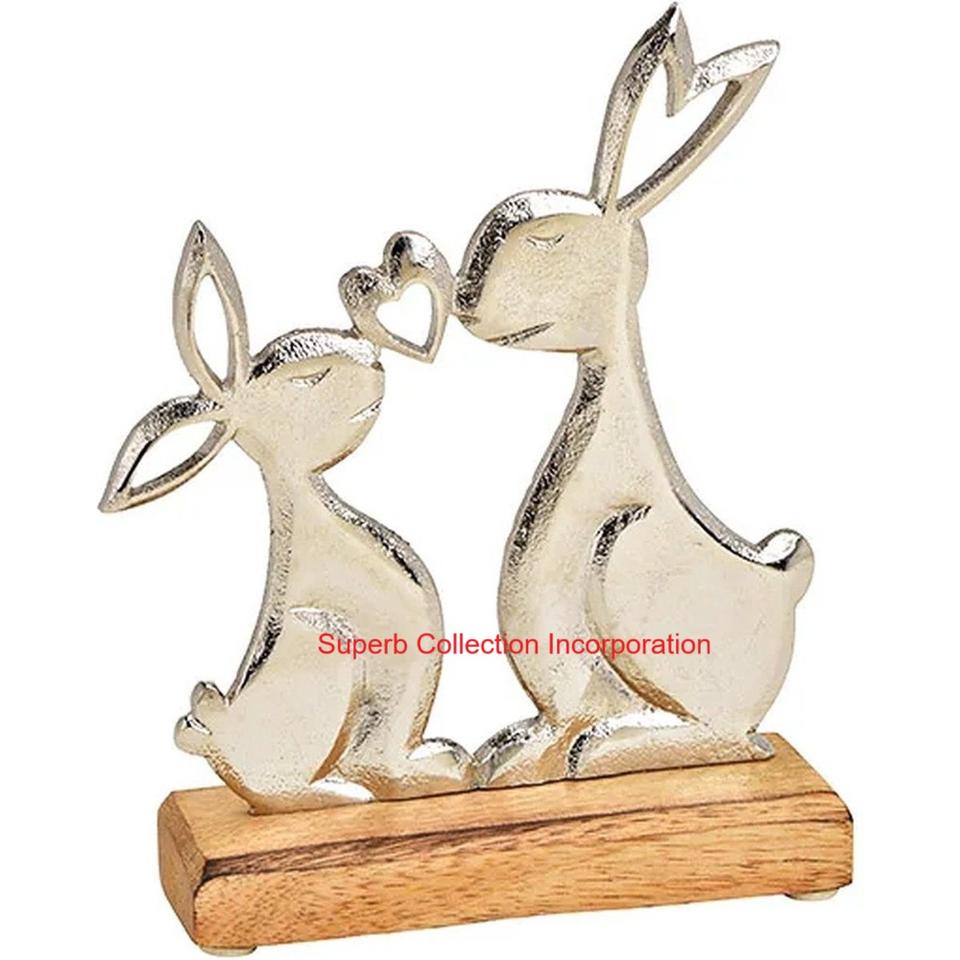 Elegant Handcrafted Silver Metal Figurine With Heart Wood Base Modern Romantic Accent On Bunny Statue For Home Decor