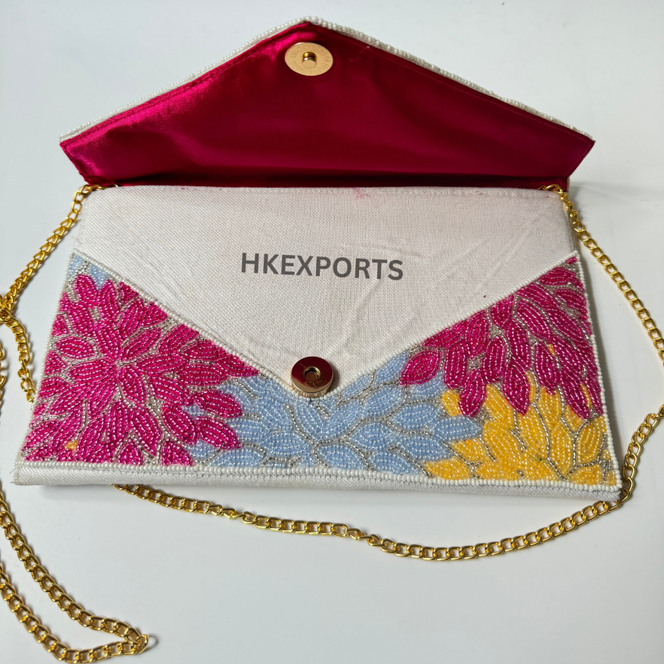 Elegant Handmade Beaded Clutch Purse with Delicate Floral Design and Lustrous Pearls Perfect for Weddings and Special Occasions