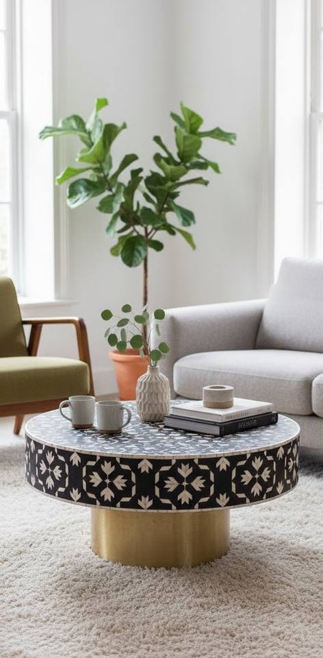 Elegant Handmade Eco-Friendly Modern Waterproof Lightweight Bone Inlay Round Coffee Table for Home and Office Interior