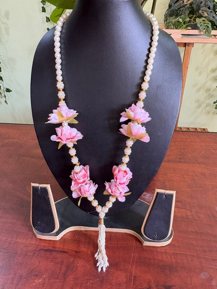 Elegant Handmade Floral Pearl Necklace Set with Blossom Accents and Beaded Tassel Traditional Festive Jewelry for Weddings