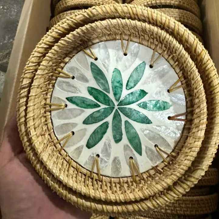 Elegant Handwoven Rattan Tray Featuring Mother of Pearl Mosaic for Dining and Coffee Table Vietnam