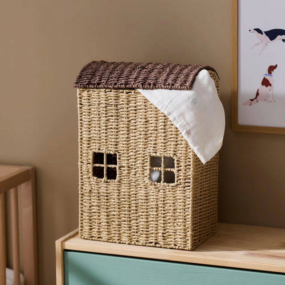 Elegant House Shape Rattan Storage Basket With Lid Handwoven Toy Organizer Wicker Kid Hamper Decorative Basket For Kids Room