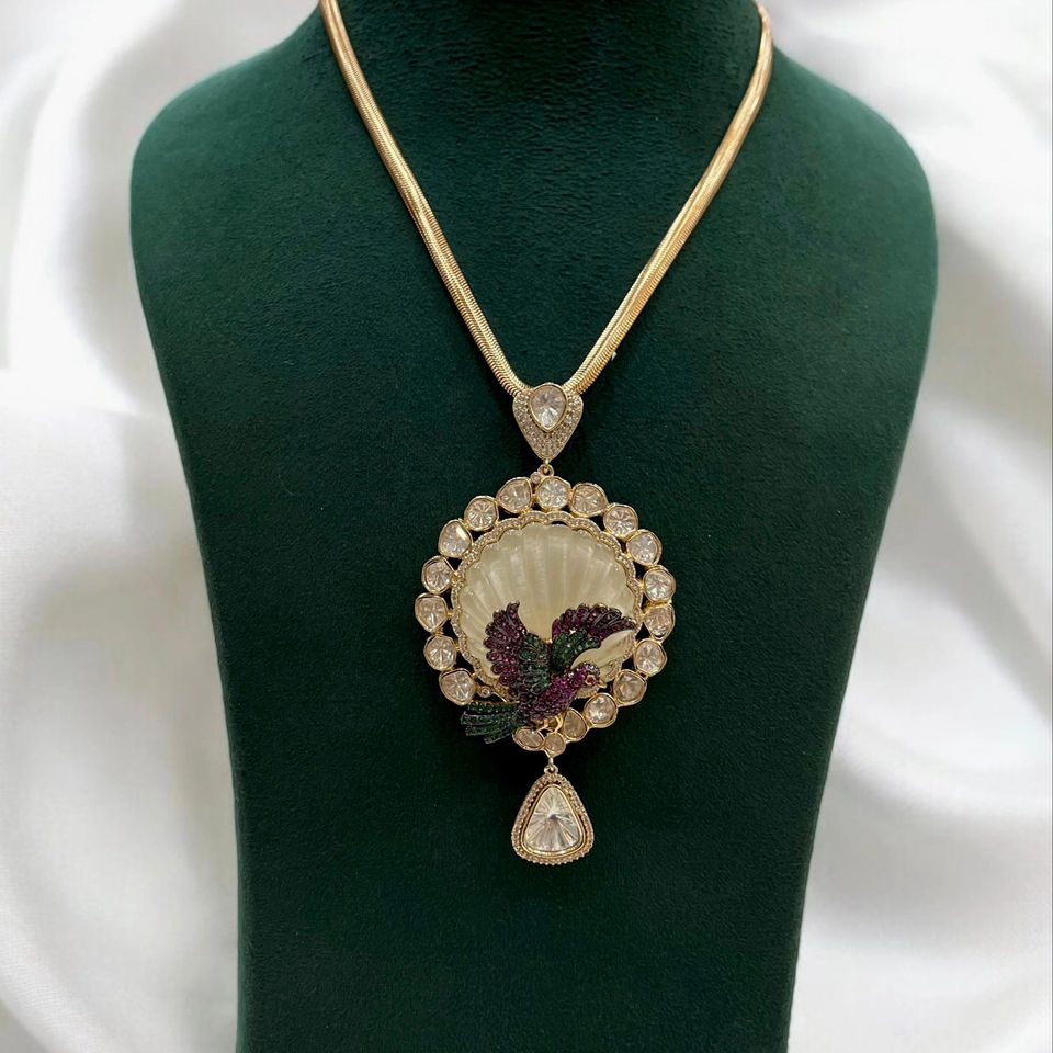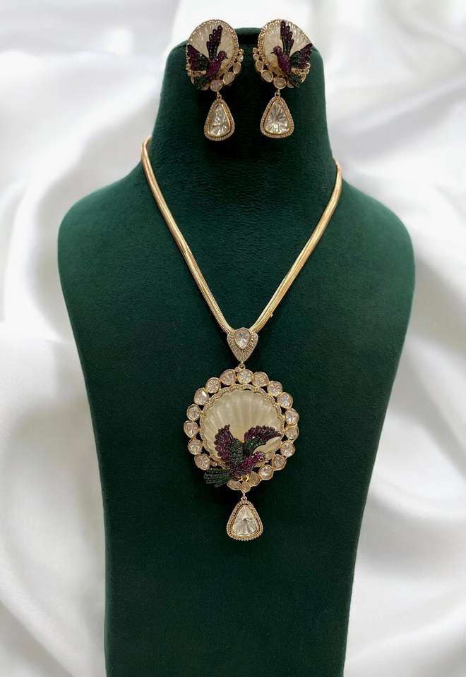Elegant Kundan Polki Mother of Pearl Choker Necklace Set with Bird Motif and drop Earrings