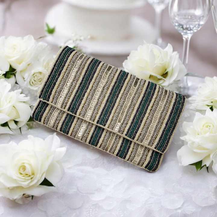 Elegant Large Capacity Portable Evening Bag Vertical Embroidered Gold Black Beaded Striped Pattern Light Weight Chains Daily