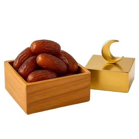 Elegant Light Wood Date Box with Golden Crescent Lid Eid Mubarak Gift Box for Ramadan Celebration