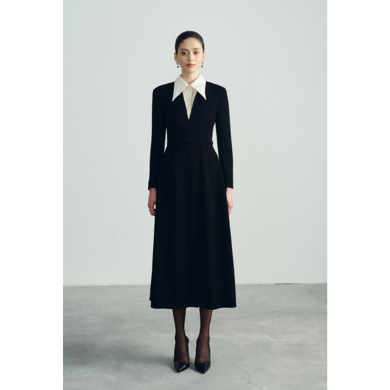 Elegant Long Black Flared Women's Dress With Collar 100% Polyester ANDREA MIDI DRESS Custom Labels Tags WHITE ANT Manufacturer