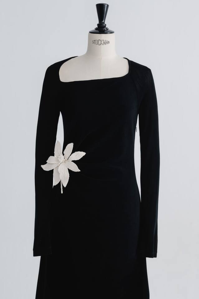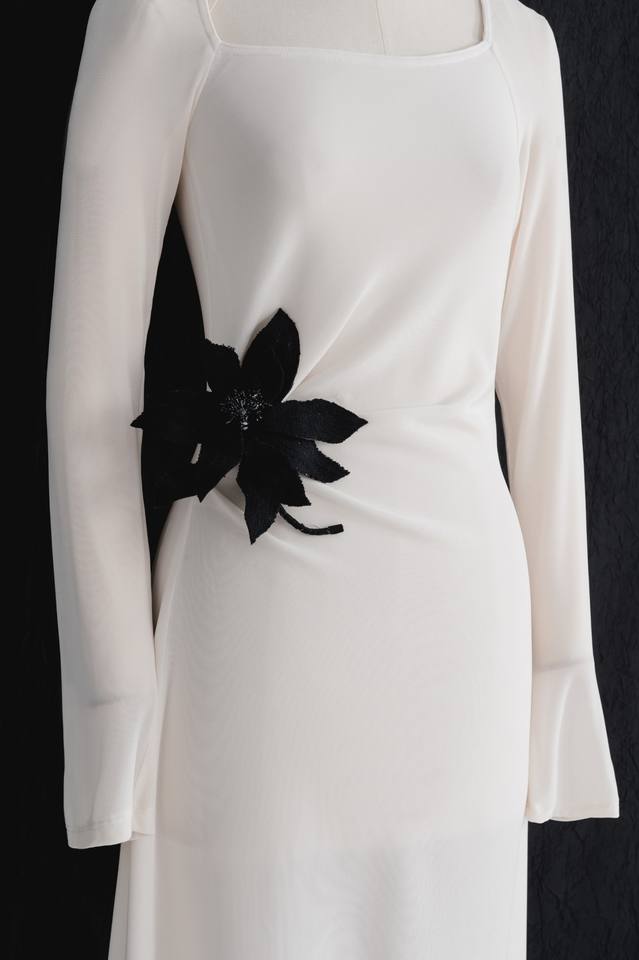 Elegant Long-sleeve A-line Long Women's Dress Black & White ABOLI ASYMMETRIC DRESS Quality Glimmer Knit Flex Fabric WHITE ANT