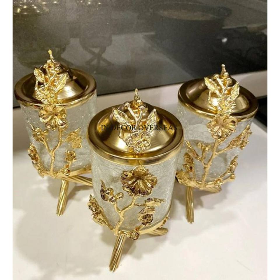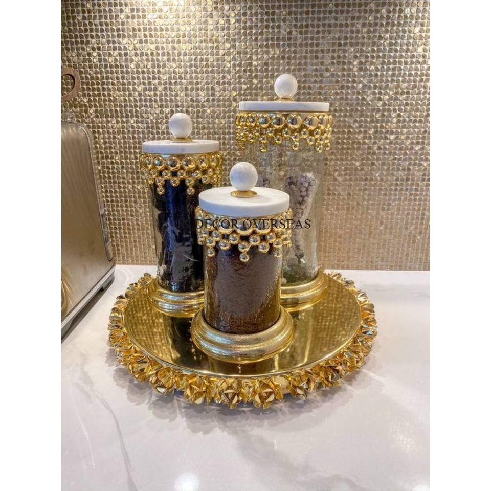 Elegant Look High Grade Gold Plated Metal Unique Designer Clear Glass Bakhoor & Other Items Storage Canister With Marble Top Lid