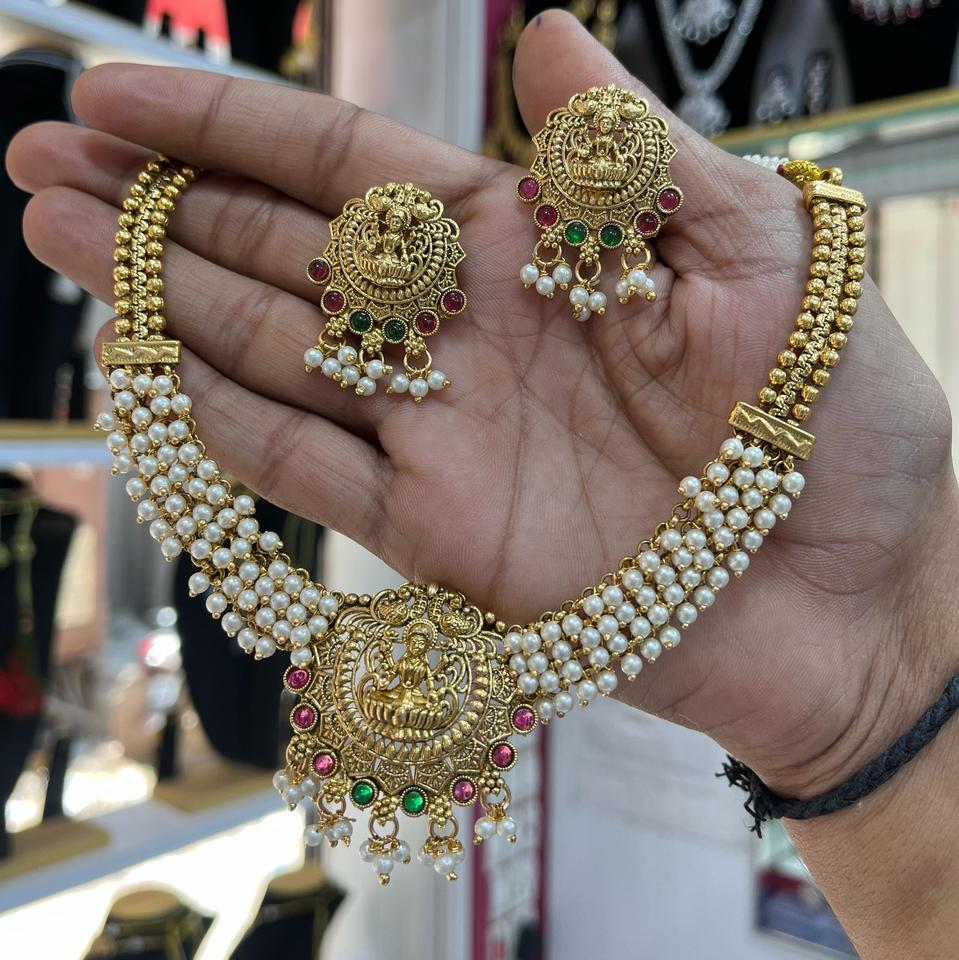 Elegant Luxury Classic Wedding Pearl Brass Gold Plated Necklace & Earring Set with Trendy Bridal Jewelry