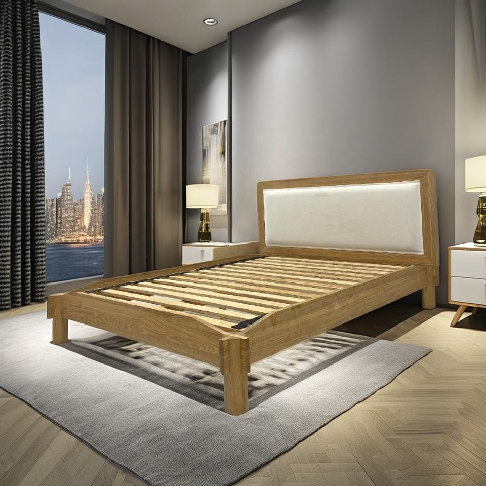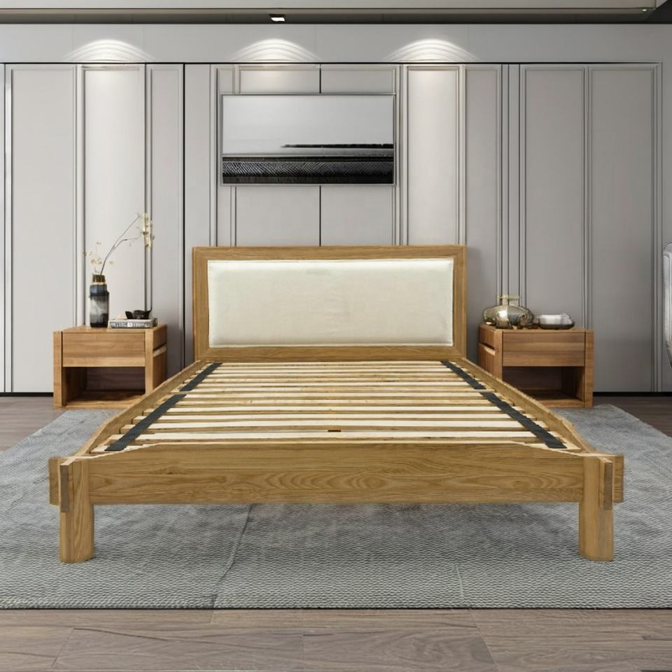 Minimalist Solid Wooden Slatted Bed Frame Bedroom Furniture Platform Bed Upholstered Fabric Headboard OEM Factory Direct Price