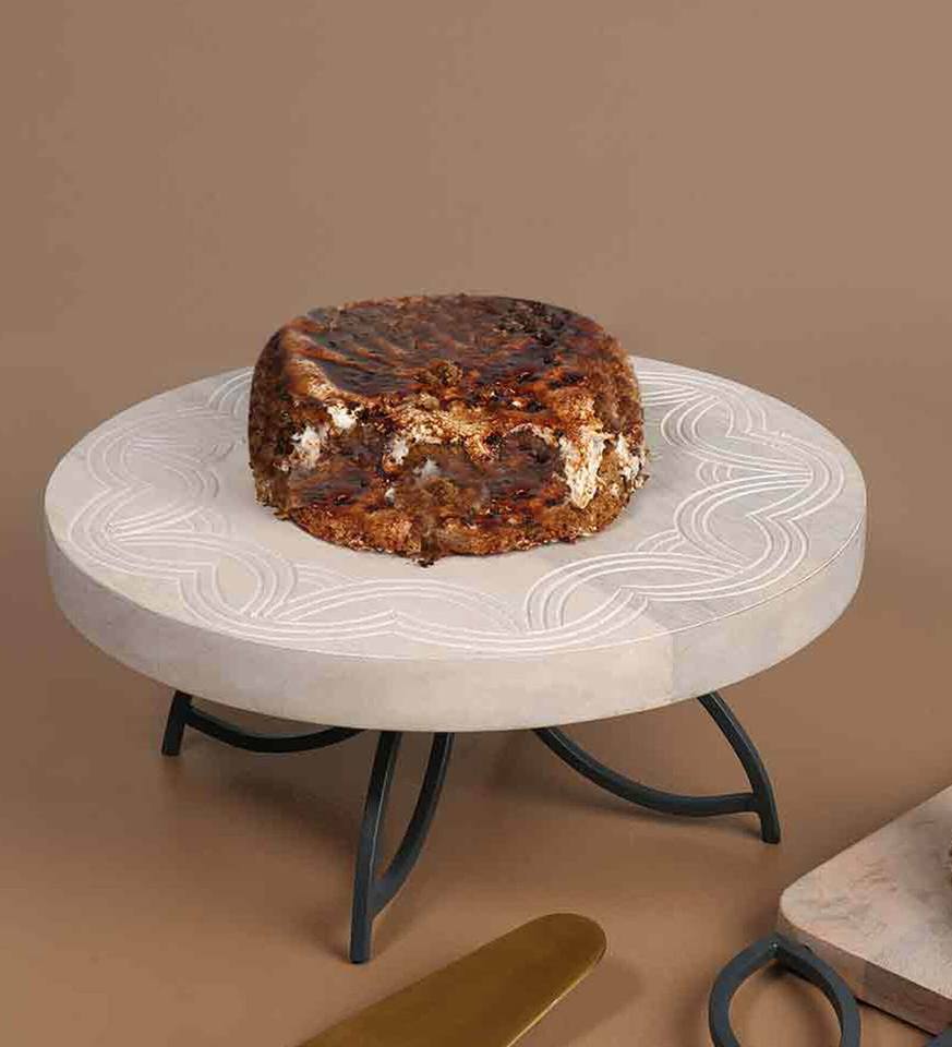 Elegant Modern Display Stand with Unique Floral Wood Engraving Black Base & Curved Metal Sheet for Cake Tools