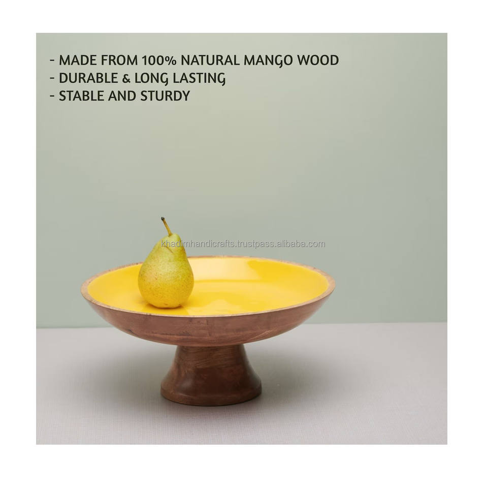 Elegant Modern Mango Wood Fruit Bowl Set, Large, High Glossy Finish with Yellow Square Patterns, Vintage Style for Wedding