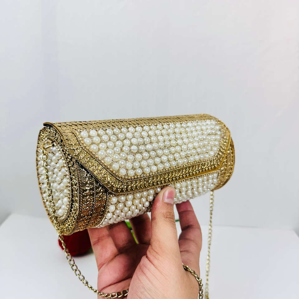 Elegant Antique Modern Polished Gold-Plated Metal Clutch Intricate Beading Work White Pearl Beads Flap Closure Design Sculpture