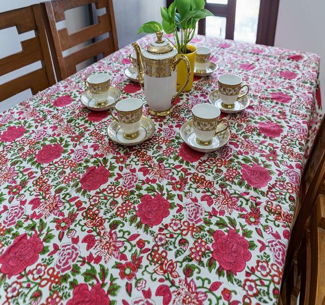 Elegant Modern Square Floral Block Printed Premium Waterproof Table Cover Thick Cotton Woven Fabric Easy to Clean